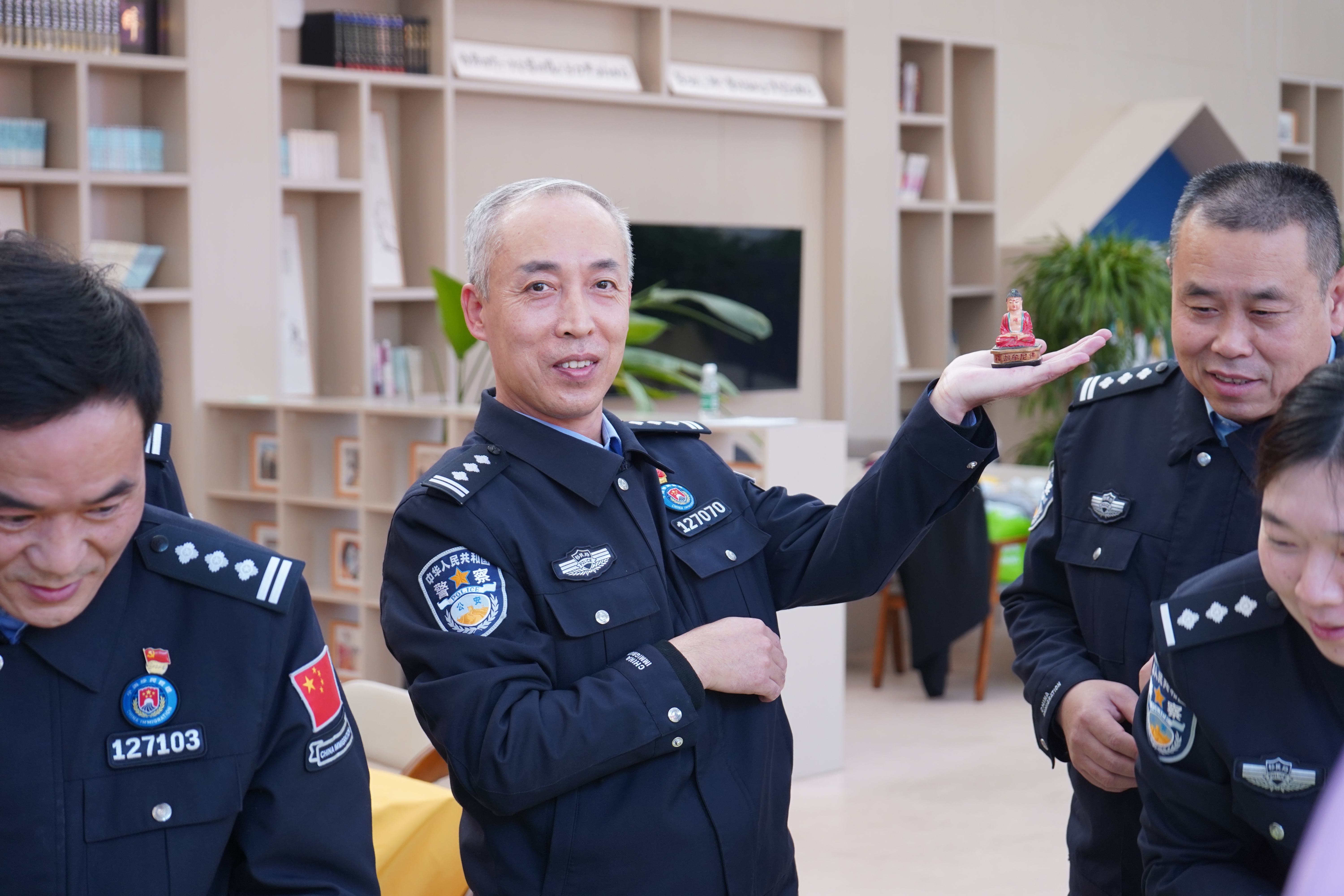 随后,活动进入了“别人眼中的我”环节。民警们轮流担任案主,戴上眼罩,由其他成员选择沙具来代表案主,并放置在其面前。案主摘下眼罩后,需解释沙具的象征意义,并猜测赠送者。这一环节不仅增进了民警之间的相互理解,还让他们从多个角度认识了自己,收获了意想不到的自我认知。