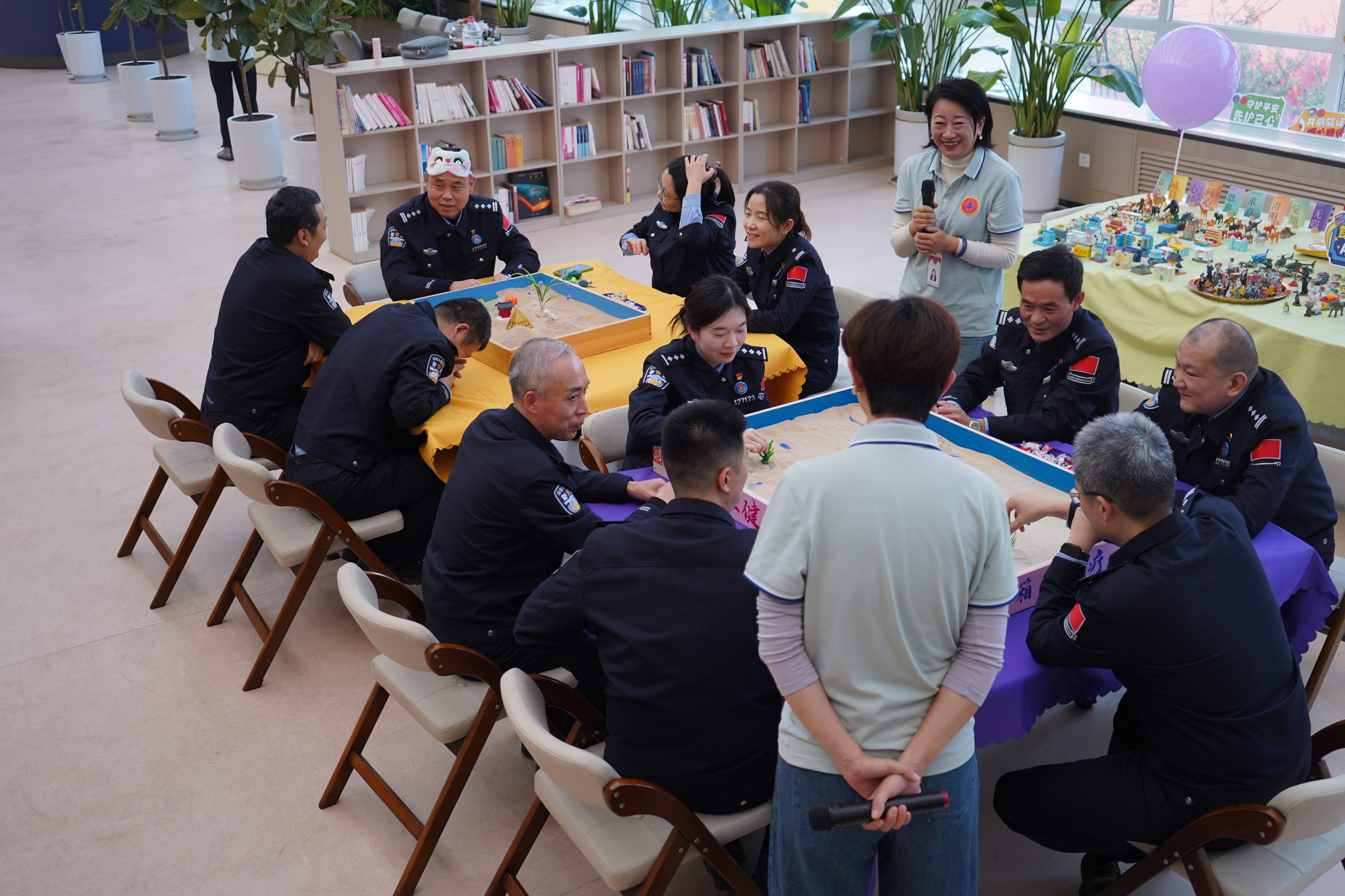 活动伊始,由天津分中心心理咨询师引导民警们走进沙盘的世界。沙盘游戏,源自荣格分析心理学理论与东方哲学文化的融合,以其独特的象征性表达和非语言的治愈方式,成为了本次活动的核心。民警们被邀请选择一件沙具代表自己,并在30秒内分享选择理由。这一环节不仅让民警们初步体验了沙盘游戏的魅力,更为后续的互动交流奠定了基础。