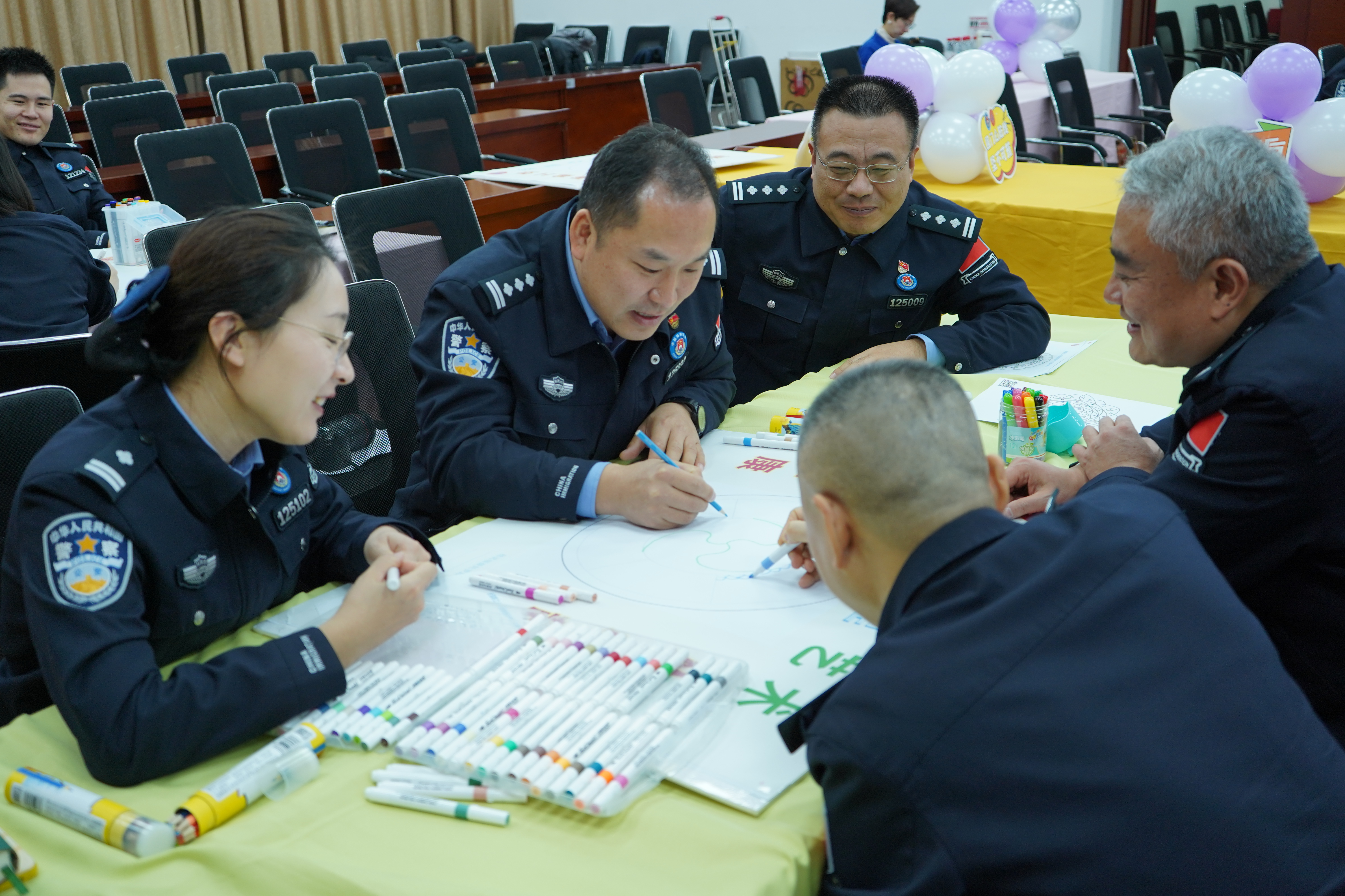随后,活动进入“曼陀罗绘画”环节,每位民警挑选一张曼陀罗卡片,用彩铅进行自由创作。曼陀罗,这一源自公元4世纪古印度的神秘图案,被瑞士心理学家荣格引入心理学领域,具有自我探索、缓解情绪、疗愈身心及培养积极品质的功效。在绘画过程中,民警们沉浸在色彩与线条的世界中,感受着内心的平静与释放。紧接着是“团队罗盘·共绘同心圆”环节,民警们围绕曼陀罗作品,分享各自的创作感受与心得,进一步加深了彼此之间的理解与信任。