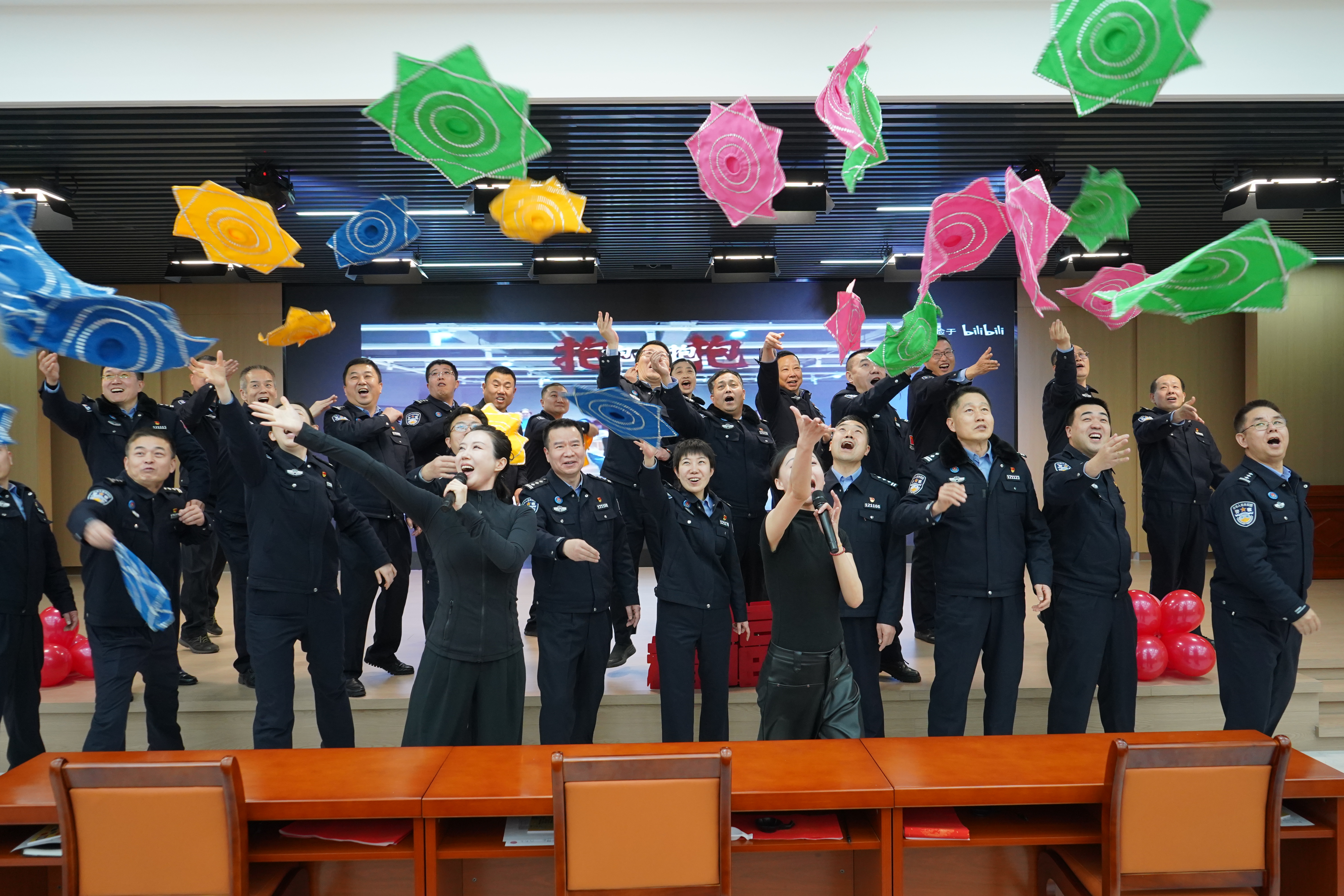 为了进一步增强团队协作能力,活动还特别设置了分组展示环节。各组民警在舞动疗愈老师的指导下,转圈逐渐加大难度,进行肢体动作的展示。最终,全体民警在喜庆欢快的音乐中,按照指令抛出手绢,将节日氛围推向了高潮。这一环节不仅深化了民警们对12项思维能力的实践应用,更通过舞动疗愈这一非语言艺术形式,拓展了情绪表达与心理调适的新路径。