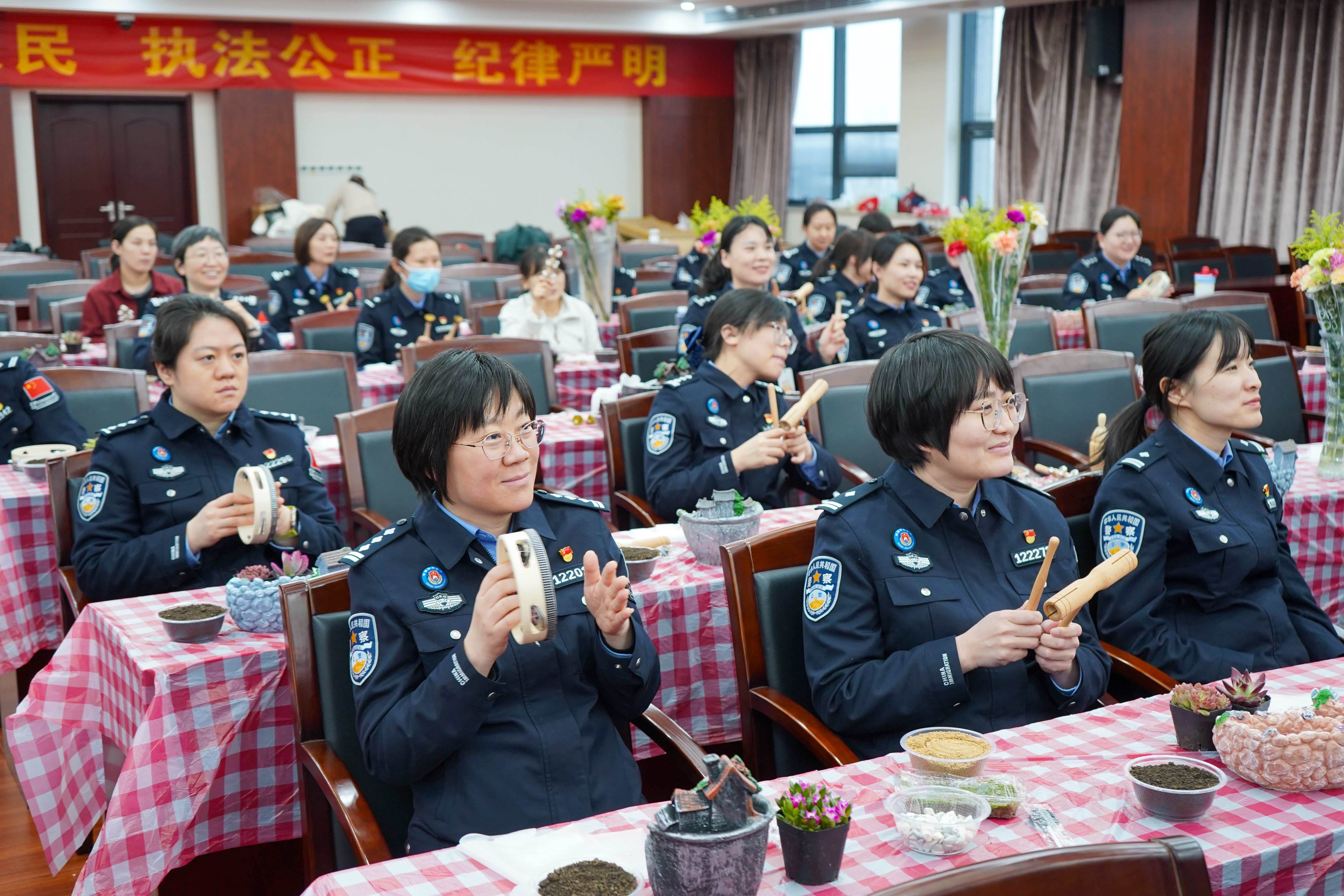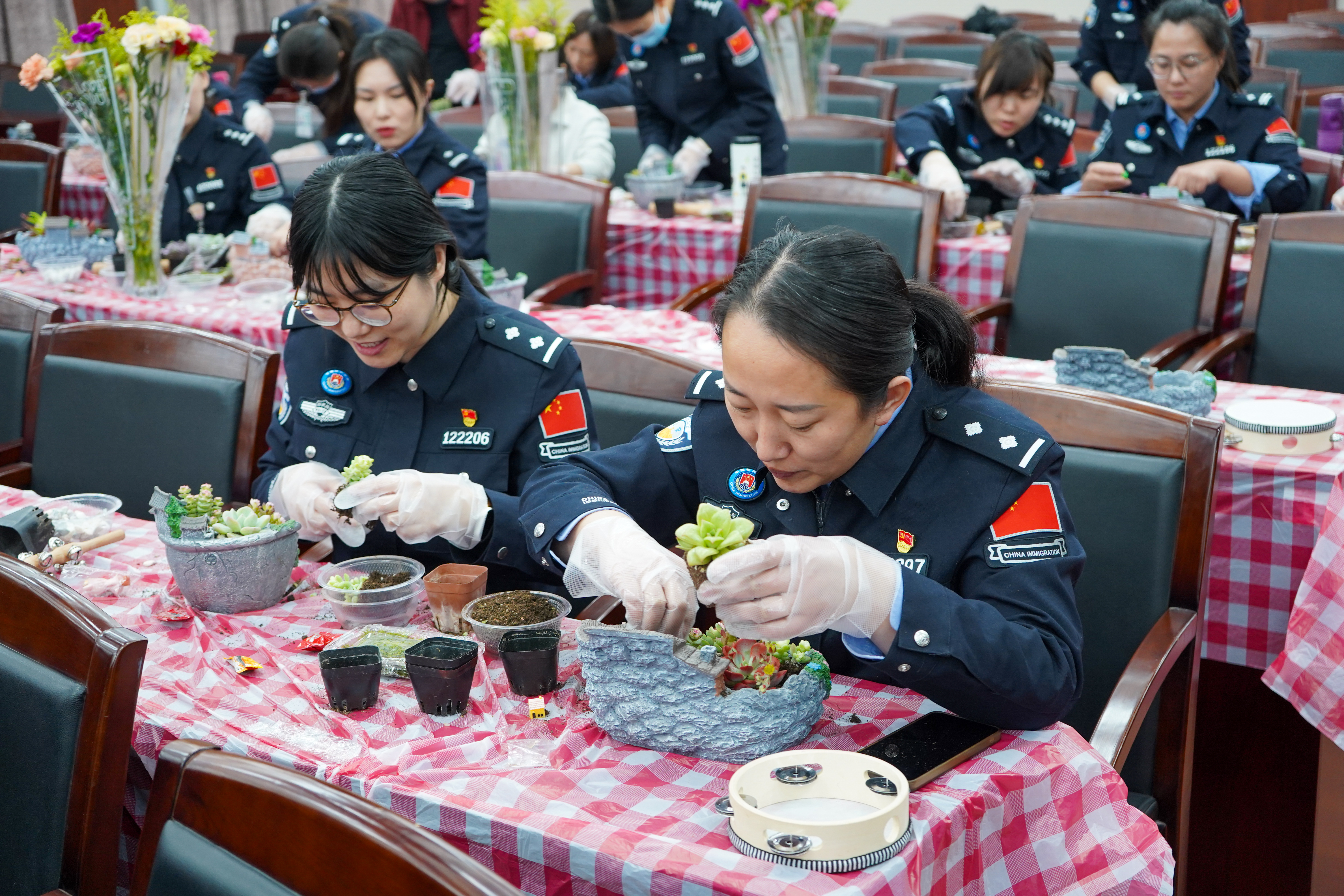 同日下午,天津分中心与天津机场边检站工会带来了“音韵绿意 巾帼雅集”活动。活动以音乐与绿植为媒介,别具一格。在轻松的破冰互动后,女职工们通过音乐疗愈环节释放压力、舒缓身心。随后,大家尝试演奏空灵鼓、摇铃等乐器,在共同创编的和谐乐章中,体会到协作的默契与艺术的共鸣。活动的另一大亮点是绿植微景观盆栽手作,女职工们发挥创意,将多肉植物、苔藓与精致配饰巧妙组合,构筑出一个个生机盎然的桌面小花园。在专注与细致的创作过程中,大家不仅体验了手工的乐趣,更感受到了与自然连接的宁静与美好。